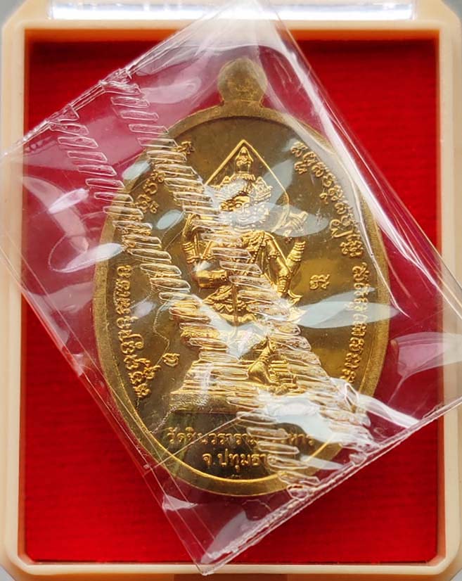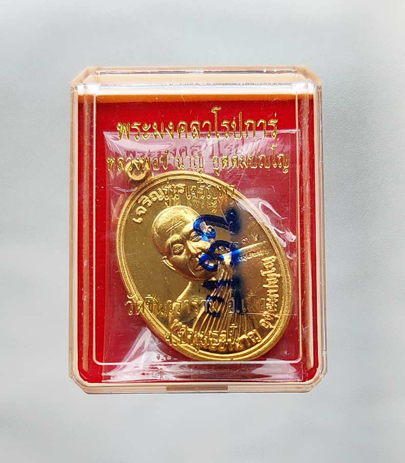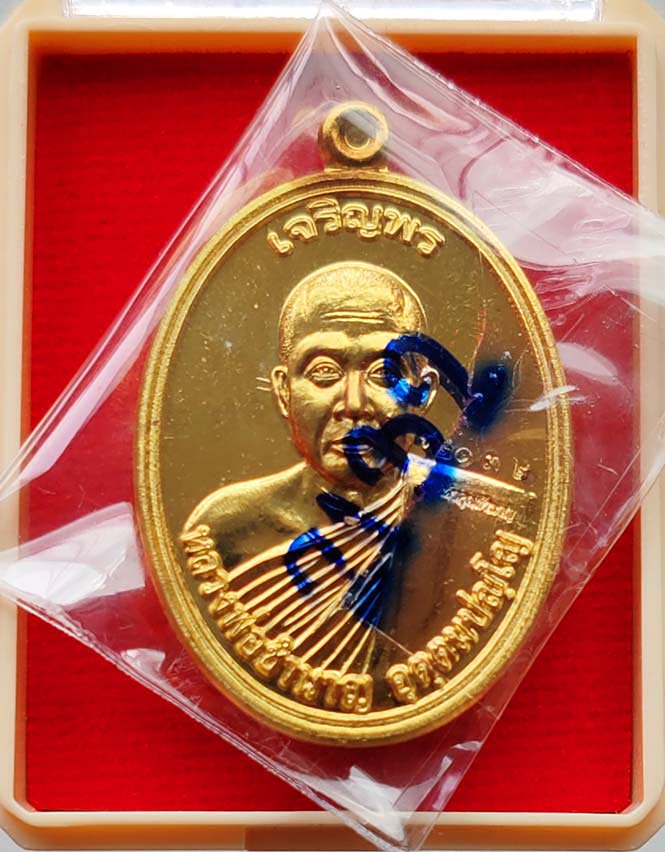 เหรียญเจริญพรบน รูปไข่ รุ่นแรก หลวงพ่อชำนาญ วัดชินวราราม จ.ปทุมธานี พิมพ์เครึ่งองค์ หลังพระพรหม(นิยม) เนื้อทองทิพย์-ผิวกระจก ปี'58 ผิวเดิม ในซีลเดิม นอนกล่องเดิม หมายเลข2132
