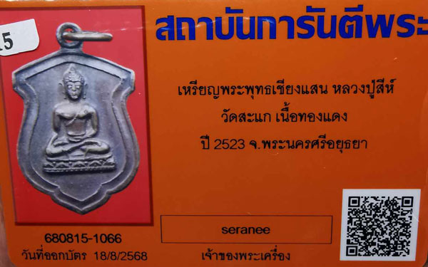 เหรียญพระพุทธเชียงแสน หลวงปู่สีห์ วัดสะแก เนื้อทองแดง ห่วงเดิม ปี2523 จ.พระนครศรีอยุธยา + บัตรG-pra สภาพเดิมค่ะ |
