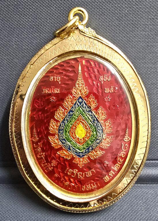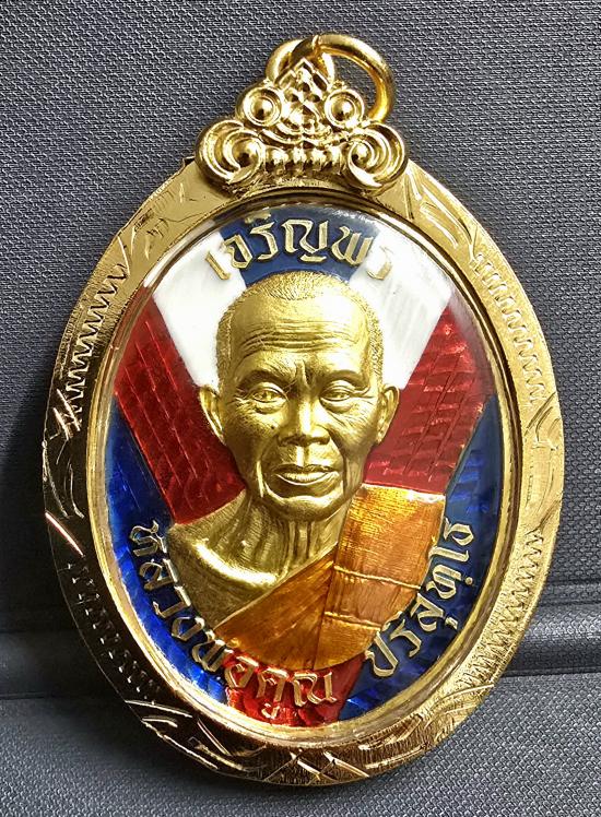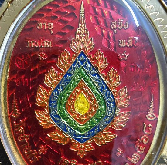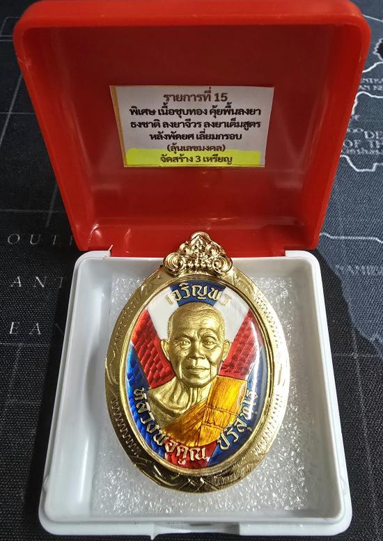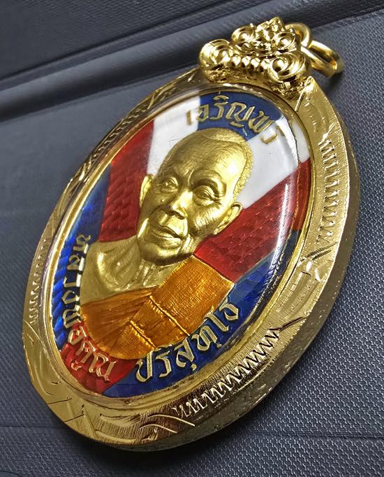 เนื้อชุบทอง คุ้ยพื้นลงยาลายธงชาติแนวเฉียง(ลายอุลตร้าแมน) ลงยาจีวร ลงยาเต็มสูตรหน้า-หลัง ด้านหลังพิมพ์พัดยศ