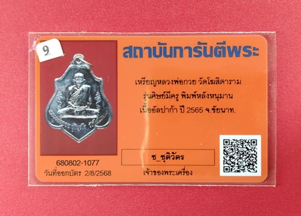 เหรียญหลวงพ่อกวย ชุตินธโร รุ่นศิษย์มีครู เนื้ออัลปาก้า หลังหนุมาน ปี 2565 บัตรรับรองG พระ |