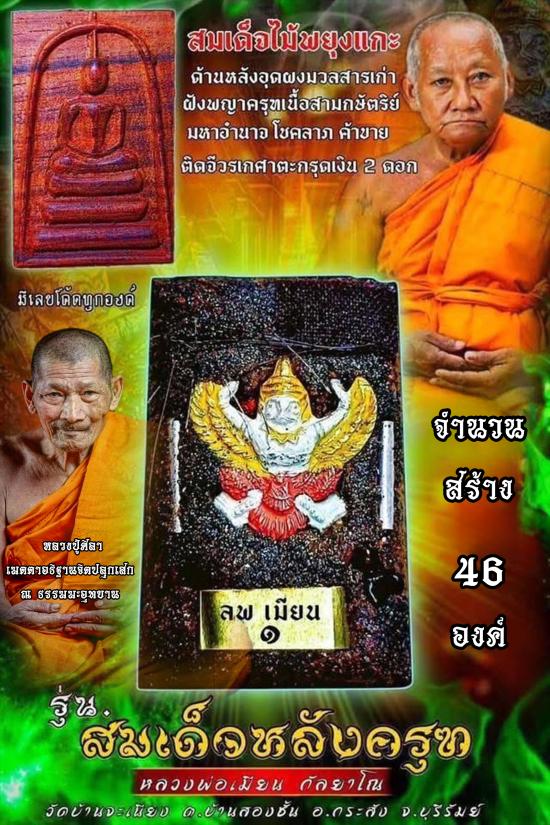 พุทธาภิเษก 3 วาระ พระสมเด็จไม้พยุงแกะ หลวงพ่อเมียน วัดจะเนียง บุรีรัมย์ หลวงปู่มหาศิลา (หลวงปู่ศิลา) อธิษฐานจิตปลุกเสก ธรรมมะอุทยานจ.กาฬสินธุ์ ด้านหลังอุดผงมวลสารเก่าฝังพญาครุฑเนื้อ3กษัตริย์ติดจีวรเกศาตะกรุดเงิน2ดอก สร้างน้อยเพียง 46 องค์เท่านั้น มวลสารเข้มขลัง สวย หายาก ปัจจุบันวัตถุมงคล หลวงพ่อเมียนขยับราคาขึ้นทุกรุ่น พุทธคุณประสบการณ์ของพระเครื่องของท่านยิ่งมากและไม่ธรรมดา จนถึงประสบการณ์ที่ผู้บูชานับถือได้ประสบพบมากับตัวเองแล้วนั้นด้วย วัตถุมงคลหลวงพ่อเมียนประสบการณ์มากมาย ห้ามพลาดด้วยประการทั้งปวงแล้วครับ รับประกันชั้นหนึ่งครับ