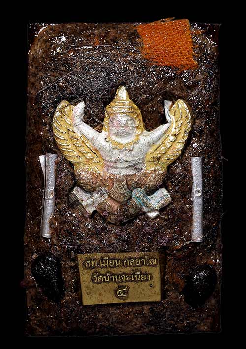 ด้านหลังอุดผงมวลสารเก่าฝังพญาครุฑเนื้อ3กษัตริย์ ติดจีวรเกศาหลวงพ่อเมียนแท้ๆ ฝังตะกรุดเงิน2ดอก