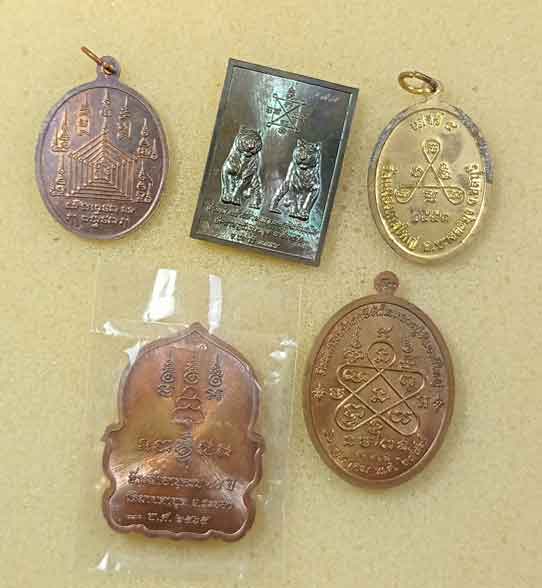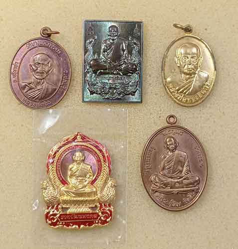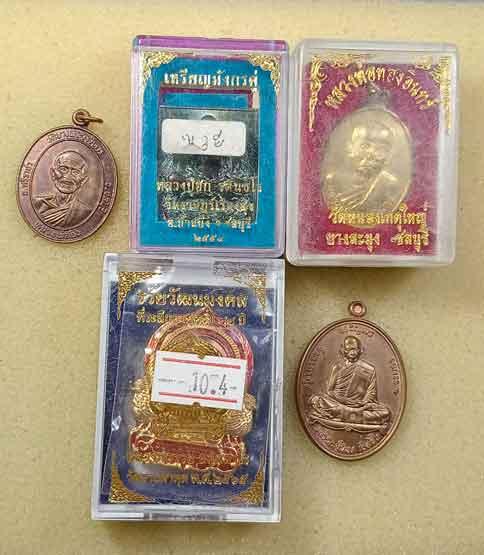 เหรียญหลวงพ่อฉิ่ง วัดบางพระ+เหรียญหลวงปู่ฮก วัดราษฎร์เรืองสุข(วัดมาบลำบิด) ชลบุรี+หลวงพ่อทองอินทร์ วัดหนองเกตุใหญ่ ชลบุรี + เหรียญหลวงพ่อรวย วัดมาบตาพุด ระยอง +เหรียญเจริญพรบน หลวงปู่ทิม ปี57