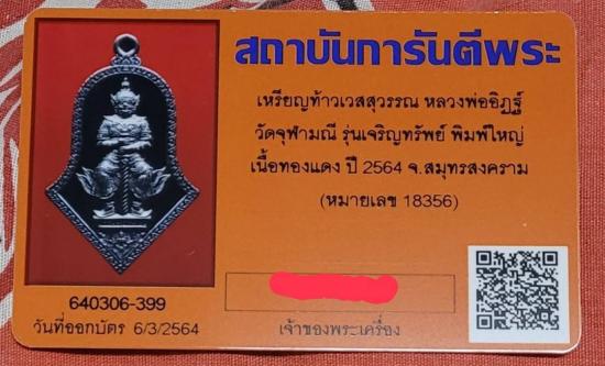 เหรียญท้าวเวสสุวรรณ หลวงพ่ออิฏฐ์ วัดจุฬามณี รุ่นเจริญทรัพย์พิมพ์ใหญ่ เนื้อทองแดง ๒๕๖๓ จ.สมุทรสงคราม (หมายเลข ๑๘๓๕๖ ) |