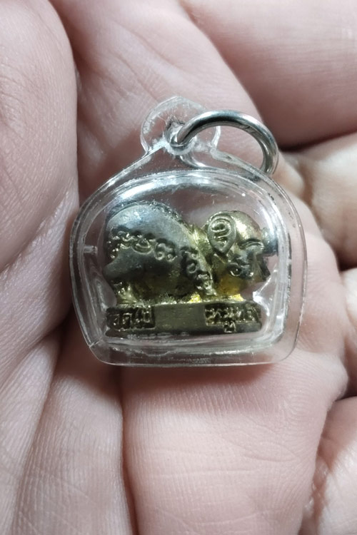 | รายละเอียด | มูทองมหาลาภ "กันภัย-โชคลาภ" คุณหมอพิพัฒน์ แพทย์ประจำโรงพยาบาลสมเด็จเจ้าพระยา ย่านคลองสาน ในสมัยนั้นเป็นผู้จัดสร้าง หมูทองมหาลาภ "กันภัย-โชคลาภ" เนื่องจากปีนั้นตรงกับ พ.ศ. ๒๕๔๑ ซึ่งเป็นปีขาล ตามโหราศาสตร์ถือว่าเป็นปีที่แข็ง คุณหมอพิพัฒน์ จึงต้องการสร้างหมูขึ้นมาสักรุ่นเพื่อเป็นเคล็ด ซึ่งก่อนหน้านั้นอาจารย์ชินพร สุขสถิตย์ (มูลนิธิหลวงปู่ทิม อิสริโก วัดละหารไร่) ก็ได้สร้างเสือ ๕๐๐ ไปแล้วในปี ๒๕๓๙ เพราะเสือกับหมูนั้นเป็นเพื่อนกัน ตามความเชื่อว่าจะช่วยเกื้อหนุนชะตาให้โชคดี มั่งคั่ง ร่ำรวย มีไว้ไม่จน คุณหมอพิพัฒน์จึงจัดสร้างหมูเนื้อโลหะขึ้นมา แล้วนำไปขอบารมีพระเกจิคณาจารย์ต่างๆ อธิฐานจิตปลุกเสก และอาจารย์ชินพร จึงแนะนำให้คุณหมอพิพัฒน์ไปขอบารมีหลวงปู่ธรรมรังษีให้ท่านเมตตาอธิฐานจิตปลุกเสก หมูทองมหาลาภ "กันภัย-โชคลาภ" นี้ด้วย ซึ่งหลวงปู่ธรรมรังษีท่านก็ได้เมตตาอธิฐานจิตปลุกเสกให้ ส่วนตัวคุณหมอพิพัฒน์เป็นผู้สนใจและศึกษาเรื่องพลังแห่งอำนาจจิตมานาน เมื่อเห็นหลวงปู่ธรรมรังษี และได้สัมผัส หมูทองมหาลาภ "กันภัย-โชคลาภ" ที่หลวงปู่ท่านเพิ่งอธิฐานจิตปลุกเสกเสร็จ ถึงกับเอ่ยบอกอาจารย์ชินพร และคณะ ว่านานๆ จะได้พบพระเก่งๆ และทรงอภิญญาญาณในยุคนี้อย่างหลวงปู่ธรรมรังษี สักองค์ อาจารย์ชินพรจึงเล่าเรื่องน่าอัศจจรย์ของหลวงปู่ธรรมรังษี เกี่ยวกับปรกใบมะขามรุ่น ๑ ให้คุณหมอพิพัฒน์ฟังว่า... วันที่ผมเอาพระนาคปรกปางสะดุ้งกลับรุ่นแรก มาฝากให้หลวงปู่ธรรมรังษีท่านอธิฐานจิตช่วงเย็นวันนั้นผมขับรถเลยไปหาหลวงปู่พรหมมา เขมจาโร วัดสวนหินผานางคอย จ.อุบลราชธานี จนถึงมืดค่ำ เพราะตั้งใจจะพักค้างคืนที่นั้นหนึ่งคืนอยู่แล้ว พอรุ่งเช้าหลวงปู่พรหมมาเล่าให้ฟังว่าหลวงปู่ที่วัดเขาดิน สุรินทร์ อธิฐานจิตสว่างจ้ามาถึงนี่เลยเมื่อคืนนี้ คุณหมอพิพัฒน์ฟังเสร็จขนลุกตั้งชันอยู่นานหลายนาทีเลยทีเดียว