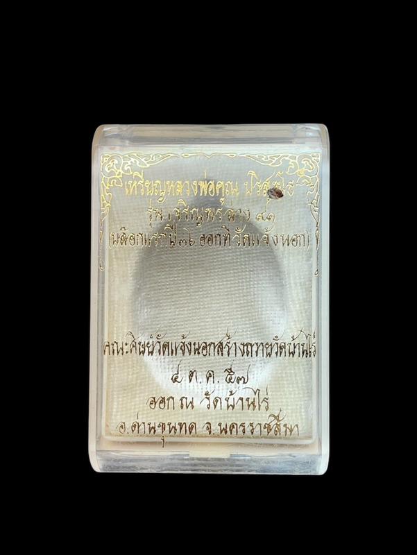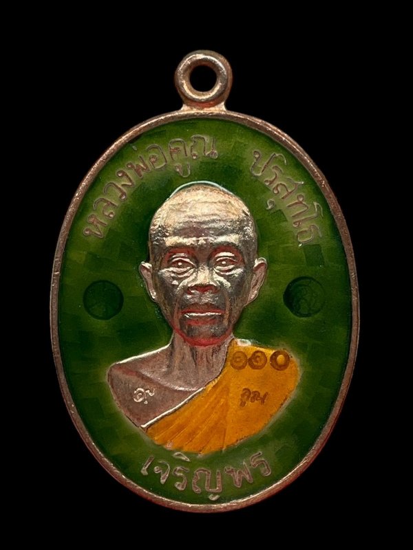 เหรียญพิมพ์จัมโบ้ หลวพ่อคูณ ปริสุทโธ รุ่นเจริญพรล่าง ๙๑ (บล็อกแรก ปี ๓๖ วัดแจ้งนอก) เนื้อนวลงยาสีเขียว หมายลข ๑๑๐ |