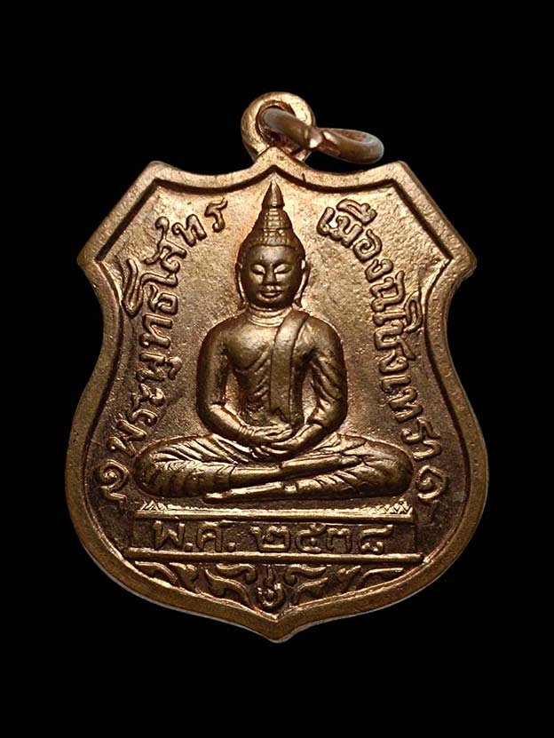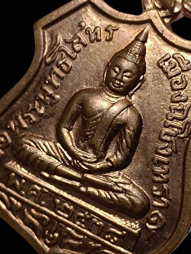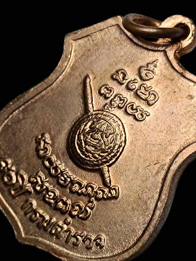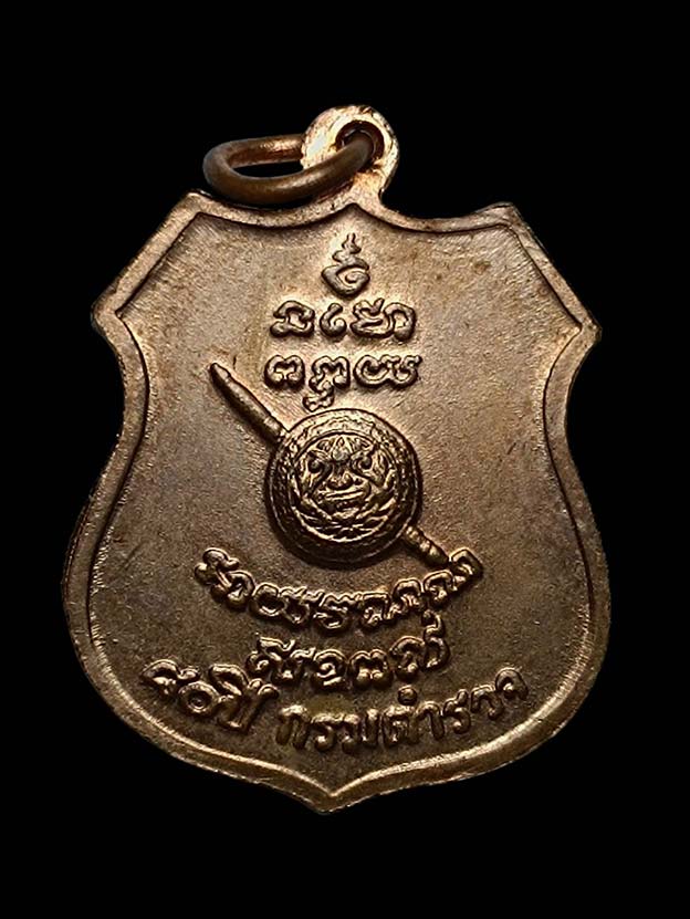 เหรียญอาร์ม หลวงพ่อโสธร ฉะเชิงเทรา ปี 2538 หลังตราโล่ ครบรอบ 80 ปี กรมตำรวจ เนื้อทองแดง จัดสร้างและเข้าพิธีปลุกเสกพร้อมกับพระพิมพ์อื่นๆ สำหรับแจกให้กับข้าราชการตำรวจและผู้มาร่วมในพิธี โดยท่าน พล.ต.ท.ไกรสุข สินศุข ผู้ช่วยอธิบดีกรมตำรวจ(ยศในขณะนั้น)ซึ่งท่านเป็นรองประธาน คณะกรรมการดำเนินการจัดสร้าง ท่านได้มีความห่วงใยข้าราชการตำรวจชั้นผู้น้อยและที่มีรายได้น้อย อาจไม่มีโอกาสในการเป็นเจ้าของพระรุ่นนี้ ท่านจึงเสนอคณะกรรมการ ฯ ให้จัดสร้างเหรียญสำหรับแจกข้าราชการตำรวจขึ้นมาชุดหนึ่งก็คือ เหรียญโล่เนื้อทองแดงนี้ โดยใช้รูปแบบของเหรียญ 2460 มาเป็นต้นแบบ และพระชุดนี้ได้รับความกรุณาจากผู้บริหารบริษัทแพนด้า ฯ จัดทำให้ฟรีไม่คิดค่าใช้จ่ายแต่อย่างใด คณะกรรมการ ฯ จึงได้อนุญาตให้มีการสร้างได้ และ ได้นำเข้าพิธีเดียวกันกับพระพิมพ์อื่นๆ |