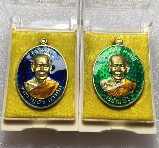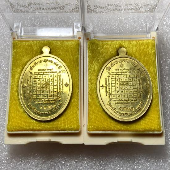 เหรียญเจริญพรบน-ล่าง หลวงปู่บัว ถามโก วัดศรีบุรพาราม จ.ตราด รุ่น เจริญพรมงคลชีวิต ๘๘ เนื้อทองทิพย์ลงยา เลข ๑๒๗๙ ปี๒๕๕๗ พระสวย มีกล่องเดิม