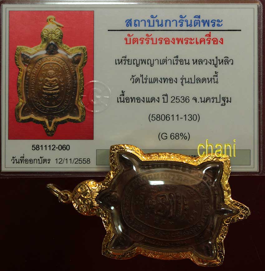 เหรียญพญาเต่าเรือน หลวงปู่หลิว วัดไร่แตงทอง รุ่นปลดหนี้ โค๊ตสั้น เนื้อทองแดง ปี2536 จ.นครปฐม สภาพสวยจมูกโด่งมีผิวไฟตามซอก เลี่ยมทอง68% พร้อมบัตรรับรองพระแท้จากจีพระ อุ่นใจได้ค่ะ