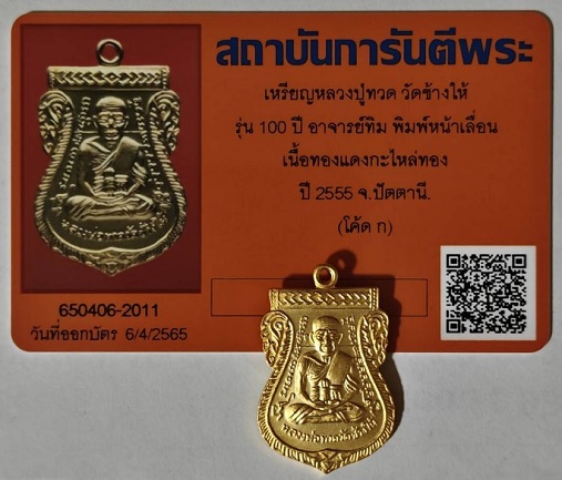 *****เหรียญหลวงปู่ทวด อาจารย์ทิม พิมพ์เสมาหน้าเลื่อน รุ่น 100 ปี เนื้อทองแดงกะไหล่ทอง ปี 2555 (โค้ด ก) วัดช้างไห้ จ.ปัตตานี |