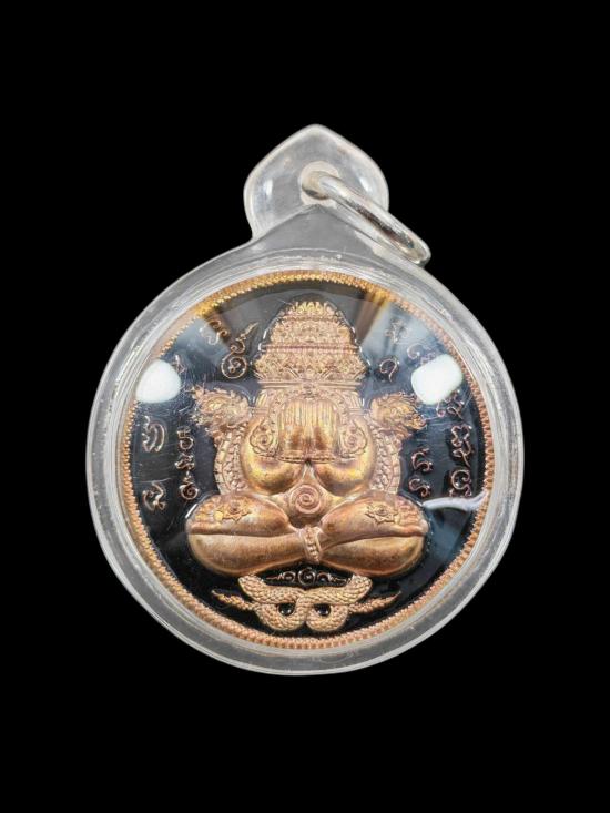 พระปิดตาพังพระกาฬ รุ่น เจ้าสัวพันล้าน โดย บอยท่าพระจันทร์ รายการลุ้นเนื้อ เนื้อทองแดงผิวรุ้งลงยาดำ เลข 212 กล่องเดิม |