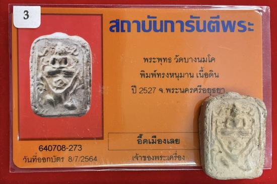 วัดใจ เคาะเดียว หลวงพ่อปาน วัดบางนมโค พิมพ์พระพุทธเจ้าทรงหนุมาน (ขี่หนุมาน) เนื้อดินเผา อุดผง ออกในปี 2527 (พร้อมบัตรรับรอง)