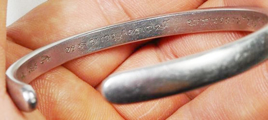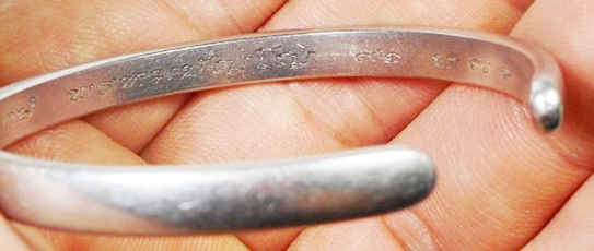 หลวงปู่เมตตาอธิษฐานจิตให้เป็นอย่างดี ณ สุสานทุ่งมน เป็นกำไล ที่มีความสวยงามเป็นทั้งของมงคลและเครื่องประดับในตัว ด้านหน้าดูแบบเกลี้ยงๆใต้ท้องกำไลมีภาษาไทย และอักขระยันต์ประจำองค์หลวงปู่ที่เปี่ยมด้วยความศักดิ์สิทธิ์เป็นตัวจมอยู่ภายใน |