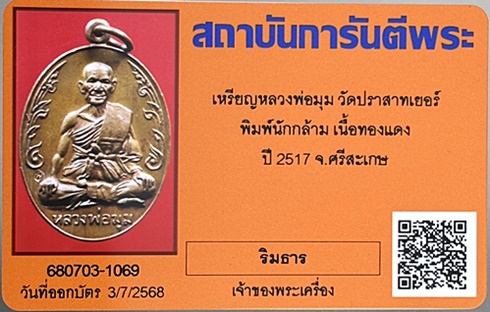 เหรียญนักกล้าม หลวงพ่อมุม วัดปราสาทเยอร์ เนื้อทองแดง ปี2517 มีบัตรรับรองจีพระ เคาะเดียว