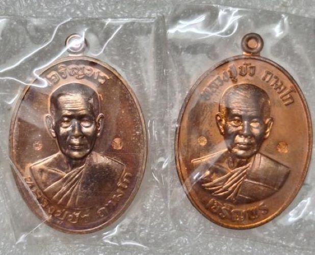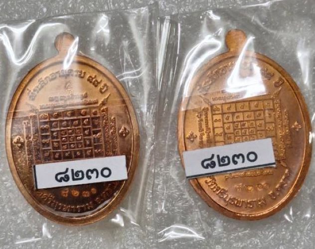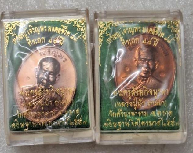 เหรียญเจริญพรมงคลชีวิต 88 ที่ระลึก 88 ปี หลวงปู่บัว ถามโก วัดศรีบูรพาราม จังหวัดตราด อธิษฐานจิตไตรมาส ปี2557 เนื้อทองแดง มาคู่ (เจริญพรบน -เจริญพรล่าง) หมายเลข 8230 (เลขเดียวกันทั้ง 2เหรียญ) |