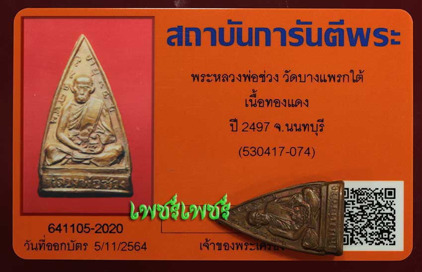 พระหลวงพ่อช่วง วัดบางแพรกใต้ เนื้อทองแดง ปี2497 จ.นนทบุรี สภาพสวยไม่ผ่านการใช้หายาก พร้อมบัตรรับรองพระแท้จากการันตีพระสบายใจได้พระแท้แน่นอน ค่ะ