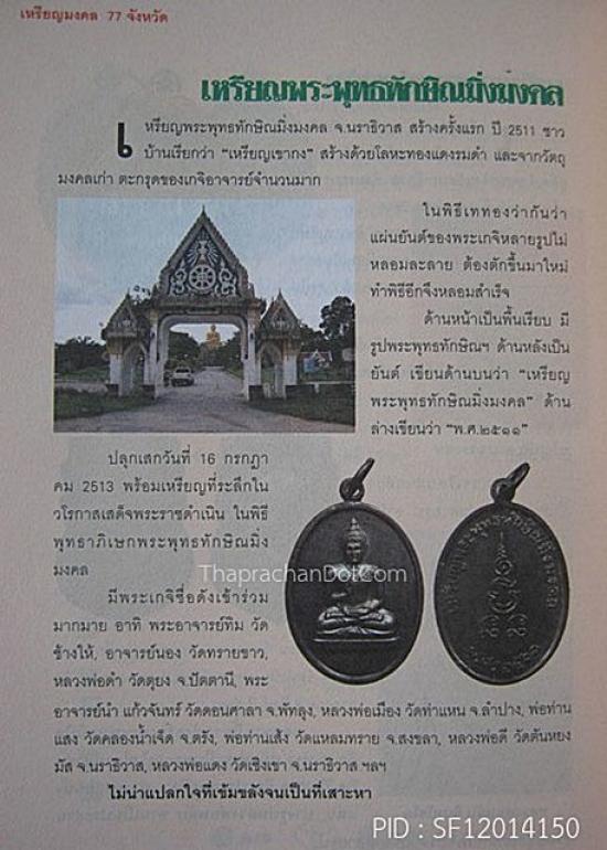 รายละเอียด เหรียญพระพุทธทักษิณมิ่งมงคล ปี 2511 วัดเขากง จ.นราธิวาส เหรียญนี้จัดสร้างโดยนำชนวนมวลสารจากเกจิอาจารย์ดัง-สายใต้มากมายหลายท่านอาทิเช่น หลวงปู่นาค วัดระฆัง อาจารย์นอง วัดทรายขาว หลวงพ่อแดง วัดเชิงเขา อาจารย์ชุม ไชยคีรี ฯลฯ และยังได้ทำการปลุกเสกอีกหลายวาระ