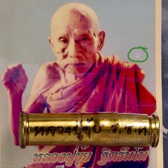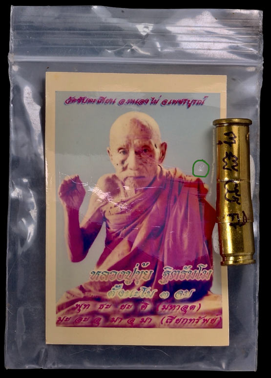 ตะกรุด ปลอกลูกปืน .38 ขนาด 4 ซม. หลวงปู่ขุ้ย วัดซับตะเคียน ปี50 + ภาพถ่าย + ซองเดิม B-1 |
