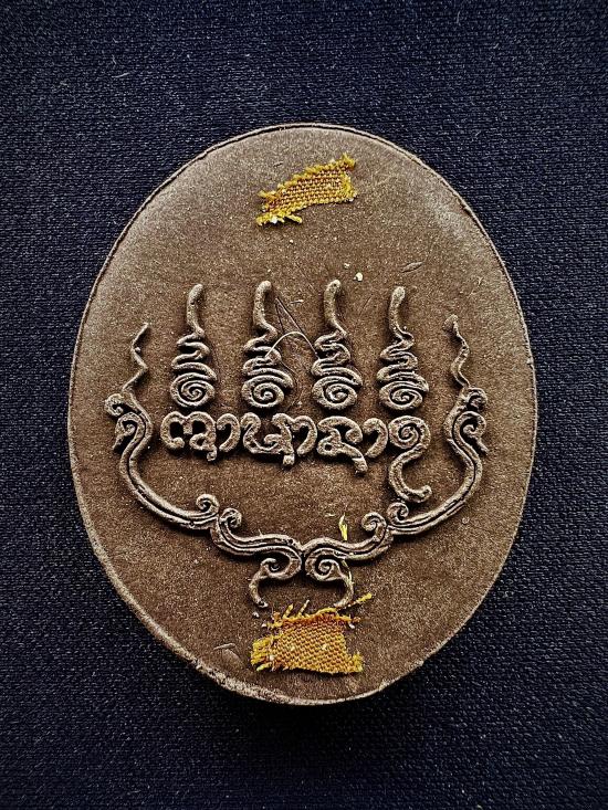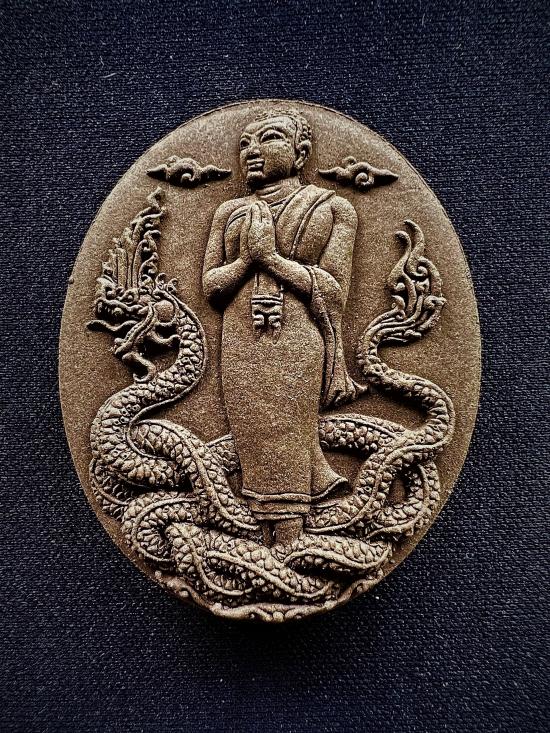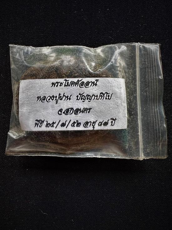 พระผงโมคคัลลาน์ ปี 52 หลวงปู่ผ่าน ปัญญาปทีโป วัดป่าปทีปปุญญาราม จ.สกลนคร ด้านหลังโรยเกศาและฝังจีวรเก่าของหลวงปู่
