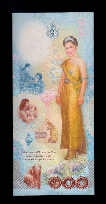 ## ธนบัตรที่ระลึก 100 บาท สมเด็จพระนางเจ้าพระบรมราชินีนาถในรัชกาลที่ 9 เฉลิมพระชนมพรรษาครบ 6 รอบ ## ไม่ผ่านการใช้ |
