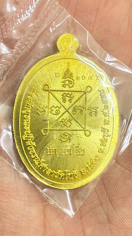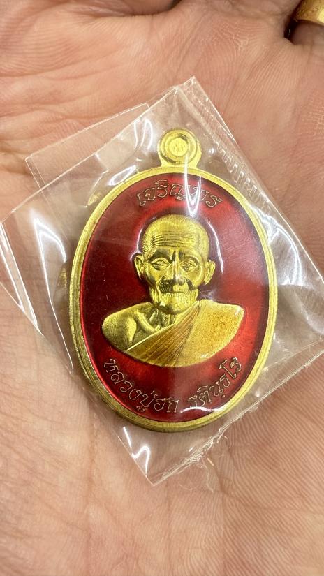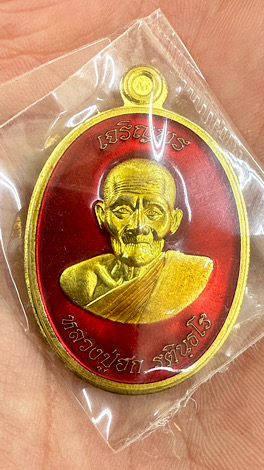 เหรียญเจริญพรบน หลวงปู่ฮก วัดโพธิ์ อ.เมือง จ.ชลบุรี เนื้อทองฝาบาทลงยาแดง จีรวรเหลือง |