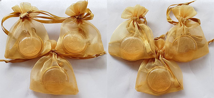 เหรียญในหลวง ร.9 หลังพระพุทธมหาวชิราอุตตโมภาส เขาชีจรรย์ ถุงเดิม เลี่ยมผ่าหวาย ติดแหนบเดิมๆ 3 เหรียญ |