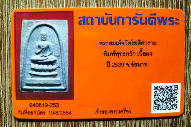 พระสมเด็จ หลวงพ่อกวย วัดโฆสิตาราม พิมพ์พุทธกวัก เนื้อผง ปี 2539 จ.ชัยนาท สภาพสวย พร้อมบัตรรับรอง
