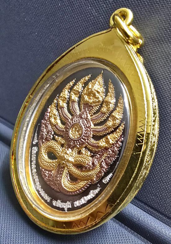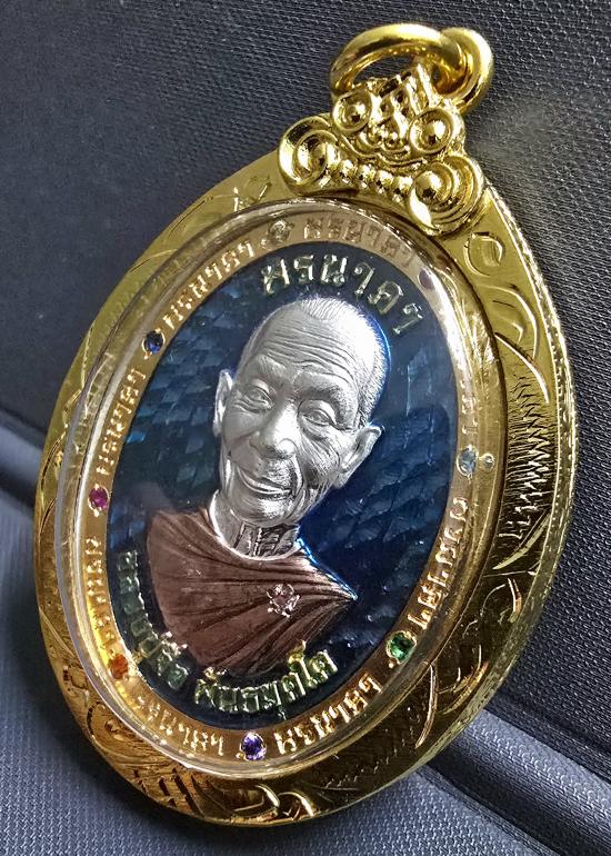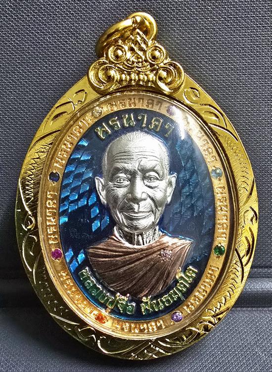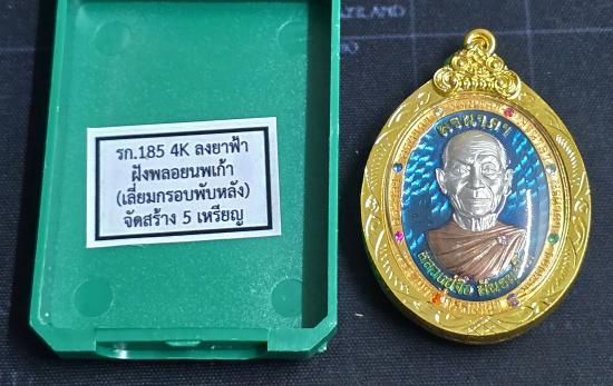 เนื้อ 4K ลงยาฟ้า ฝังพลอยนพเก้าขอบ เลี่ยมกรอบพับหลัง พระสวยมากครับ