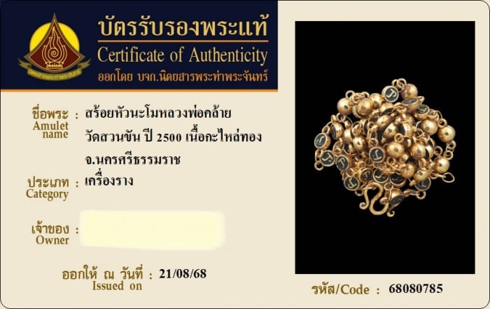 <<<วัดใจ20บาท..สร้อยหัวนะโมหลวงพ่อท่านคล้าย วัดสวนขัน จ.นครศรีธรรมราช เนื้อกระไหล่ทอง ลงถม สร้างปี 2500 (บัตรรับรองนิตยสารพระท่าพระจันทร์) สวยเดิมทุกประการ น่าบูชามากๆครับ>>>
