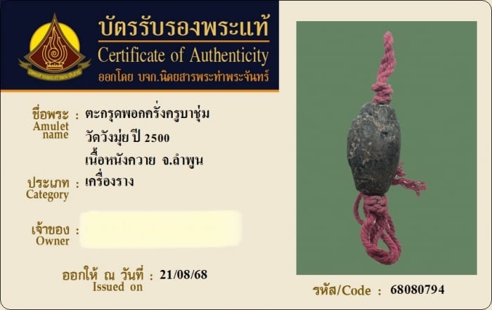 <<<วัดใจ20บาท..ตะกรุดหนังควายพอกครั่งครูบาชุ่ม วัดวังมุ่ย จ.ลำพูน เนื้อหนังควายพอกครั่ง สร้างปี 2500 (บัตรรับรองนิตยสารพระท่าพระจันทร์) ตัวจริงเสียงจริง สวยเดิมทุกประการ น่าบูชามากๆครับ>>>