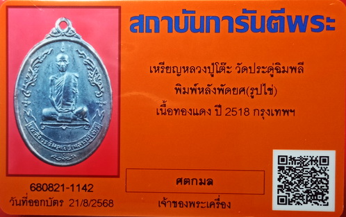 เหรียญรูปไข่หลังพัดยศ หลวงปู่โต๊ะ ปี 2518 ( เนื้อทองแดงรมดำ บล็อกใบหน้าชัด หายาก ) |