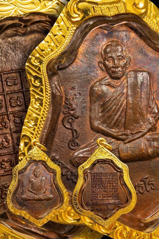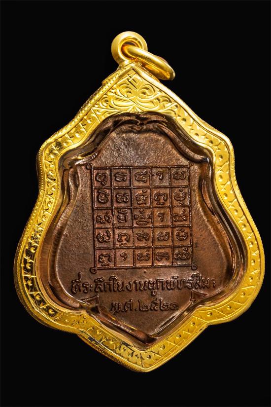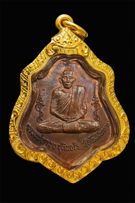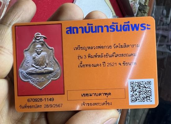 เหรียญหลวงพ่อกวยหลังยันต์ไตรสรณคมณ์ ปี 2521 สวยเดิม เลี่ยมทอง พร้อมบัตรเวปG |