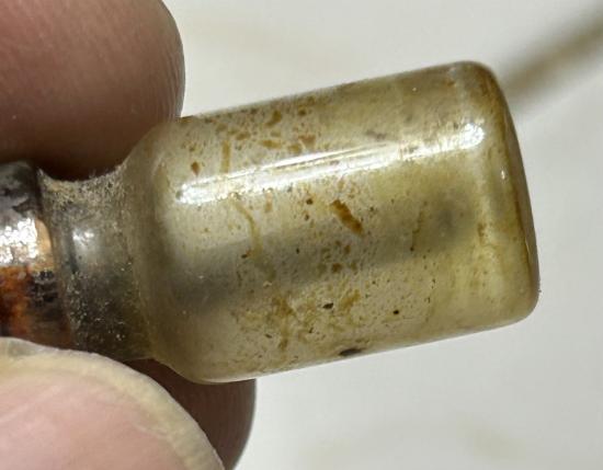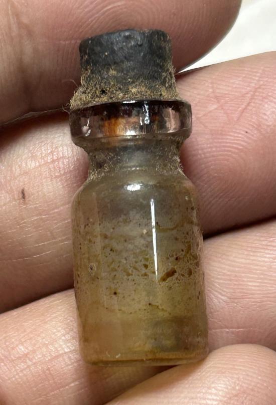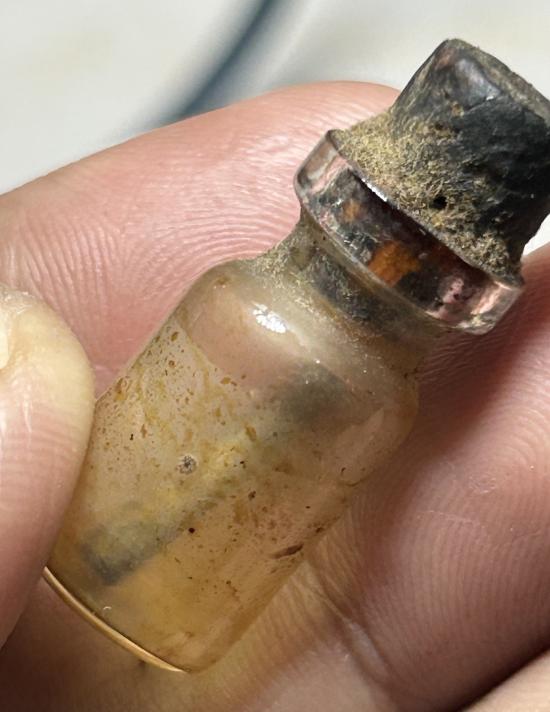 ตะกรุดในขวดแก้วปิดด้วยจุกไม้ มีคราบน้ำมันในขวดเกาะติดตามผิวขวด ผมไม่ทราบที่ พิจารณาให้ชอบก่อนเคาะนะครับ |