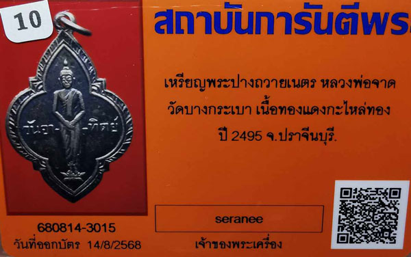 (วันอาทิตย์)เหรียญพระปางถวายเนตร หลวงพ่อจาด วัดบางกระเบา เนื้อทองแดงกะไหล่ทอง ห่วงเดิม ปี2495 + บัตรG-pra สภาพเดิมค่ะ |