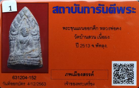 ( 1 ) พระผงบารมีคงไชยชุม พิมพ์พระขุนแผนออกศึก อ.ชุม ไชยคีรี , หลวงพ่อคง วัดบ้านสวน เนื้อผง ปี 2513 จ.พัทลุง ( มวลสารรุ่นนี้เข้มขลังมาก ) มาพร้อมบัตรรับรองพระแท้การันตีพระ สภาพพระตามรูปที่ลงทุกประการ (ขนาดประมาณ 3.5 x 2 ซม.)