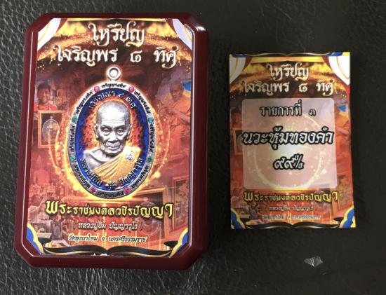 เหรียญเจริญพร 8 ทิศ หลวงปู่ออิ่ม วัดทุ่งนาใหม่ จังหวัดนครศรีธรรมราช รายการทึ่ 3 เนื้อนวะหุ้มทองคำ 99% โค๊ตพระเลข 9(เลยมหามงคล) |
