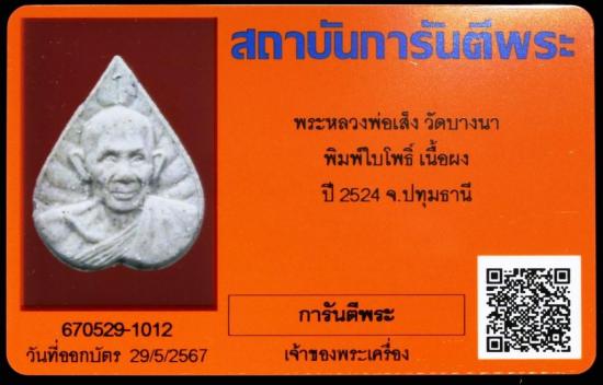 วัดใจ เคาะเดียว พระหลวงพ่อเส็ง วัดบางนา พิมพ์ใบโพธิ์ เนื้อผง ปี 2524 จ.ปทุมธานี พร้อมบัตรรับรอง |