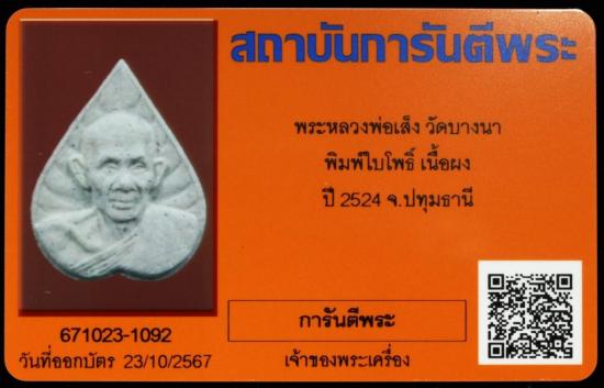 วัดใจ เคาะเดียว พระหลวงพ่อเส็ง วัดบางนา พิมพ์ใบโพธิ์ เนื้อผง ปี 2524 จ.ปทุมธานี พร้อมบัตรรับรอง |