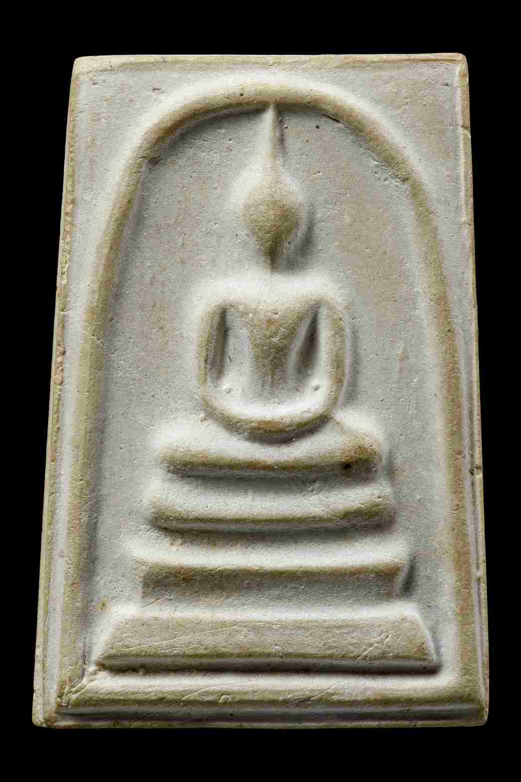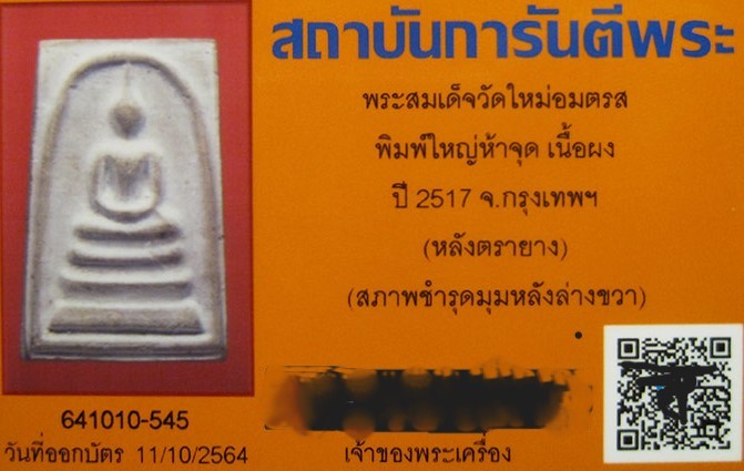 พระสมเด็จวัดใหม่อมตรส(บางขุนพรหม) พิมพ์ใหญ่ห้าจุด หลังตรายาง เนื้อผง ปี 2517 กรุงเทพ บัตรรับรอง(สภาพชำรุดมุมหลังขวา)