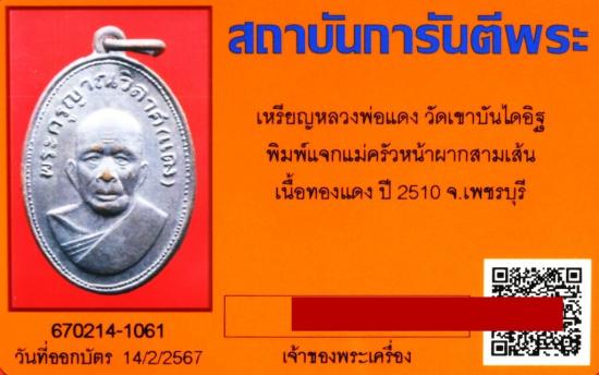 แจกแม่ครัว เหรียญหลวงพ่อแดง วัดเขาบันไดอิฐ หน้าผากสามเส้น เนื้อทองแดง ปี 2510 มีบัตรรับรอง |
