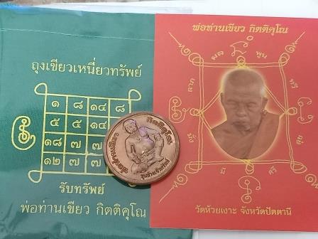 120- ถุงเขียวเหนี่ยวทรัพย์ พ่อท่านเขียว วัดห้วยเงาะ มาพร้อมเหรียญขวัญถุงขุนช้างรับทรัพย์ สุดยอดประสบการณ์ครับ สวยเดิมๆไม่ผ่านการใช้ครับ เลข 7829 |