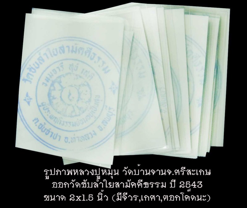 รูปถ่ายชุดนี้ ออกที่วัดซับลำใย ปี 2543 ติดจีวร+เกษา หลังปั๊มหมึกตราวัด สภาพสวยพร้อมเคลือบพลาสติกใส แจกกรรมการวัด และกรรมการอุปถัมถ์วันที่ 9 เม.ย.2543 โดยพระอาจารย์ตั้ว เจ้าอาวาสวัดซับลำใย จ.ลพบุรี (ศิษย์เอกท่านหนึ่งของหลวงปู่หมุน) โดยใช้ตรายางเดิมของวัด(ปัจจุบันได้เปลี่ยนตรายางใหม่เป็นรูปใบโพธิ์แล้ว) |