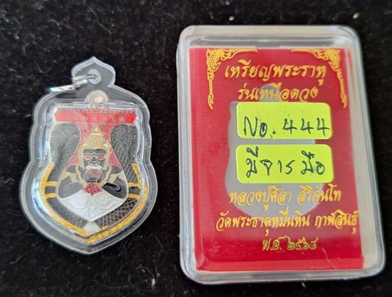 เหรียญพระราหูอมจันทร์ หลวงปู่ศิลา เมตตาอธิษฐานจิต (พระอาจารย์ต้อมเมตตาจารมือ) รุ่นเหนือดวง เนื้ออัลปาก้า เลขตอง No.444 |