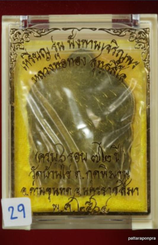 เหรียญเสมา นั่งพาน หลวงพ่อทอง รุ่น 6 รอบ 72 ปี เนื้อทองฝาบาตร ไม่ตัดปีก 9 รอบ หลังเรียบ มีจารหลวงพ่อทอง หมายเลข 29 |