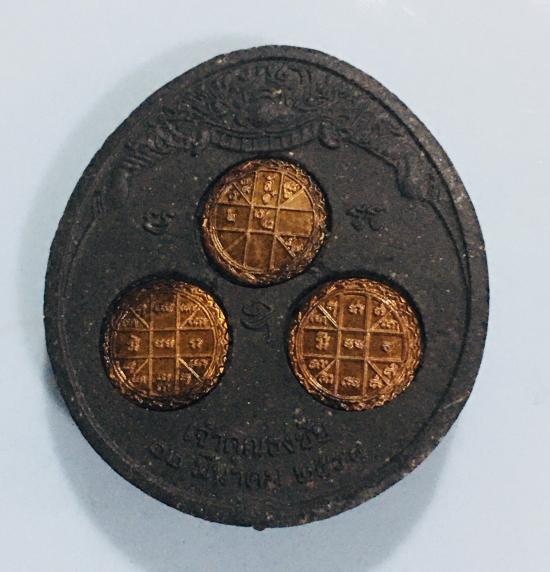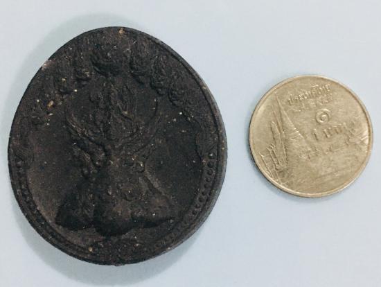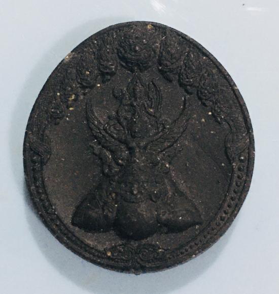 พระนารายณ์ทรงครุฑ ประทับยืนบนพระราหู ล้อมด้วยพระนวนาค 9 เศียร เนื้อใบลาน หลังฝังแผ่นยันต์หนุนดวงทองแดง วัดไตรมิตร ปี 2548 |