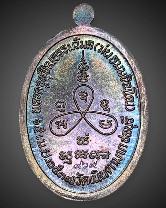 เหรียญรูปไข่ (ใหญ๋) เนื้อเงิน อายุครบ 7 รอบ พิมพ์นั่งเต็มองค์ (เลข869) หลวงปู่ม่น วัดเนินตามาก จ.ชลบุรี จัดสร้างในปี พศ.๒๕๓๗ |