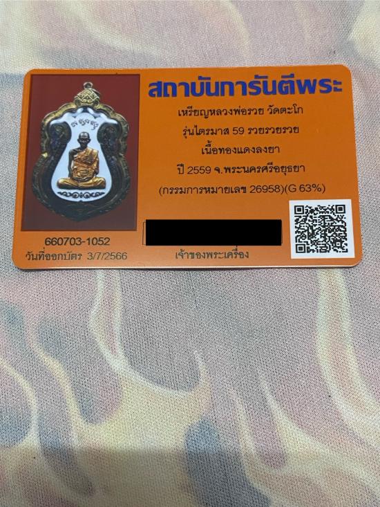 เหรียญหลวงพ่อรวย วัดตะโก อยุธยา รุ่นไตรมาส59 รวย รวย รวย เนื้อทองแดงลงยา ปี59(กรรมการ) เลข26958 เลี่ยมทองพร้อมบัตรรับรองฯ ขออนุญาตลงใหม่ครับ โอนเงินแล้วแจ้งรายละเอียดการโอนทาง Mailbox ของเวปจี ได้รับแจ้งว่าโอนเงินแล้วจะส่งพระภายใน 3 วันทำการ