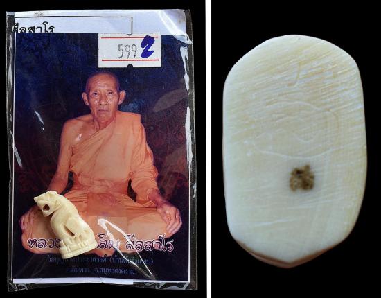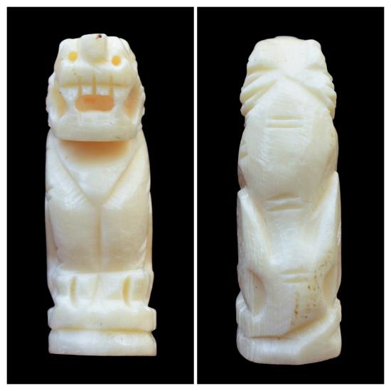 พญาเสือเจ้าพยัคฆ์ตัวจ่าฝูง (มหาอำนาจ มหาปราบ) เนื้อกระดูกแกะ ใต้ฐานหลวงปู่จารยันต์กำกับไว้ทุกตัว สร้าง  189  ตัว ปี 2551  หลวงปู่เฉลิม  วัดบุญนาคประชาสรรค์ จ.สมุทรสงคราม พร้อมซองรูปใบฝอยเดิมจากวัด  สภาพพระตามรูปที่ลงทุกประการ (ขนาดประมาณ  2.4 x 1.2  ซม.)