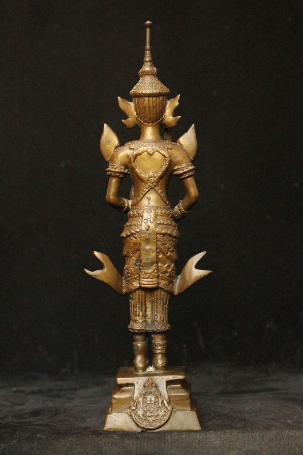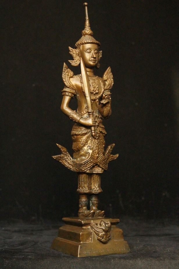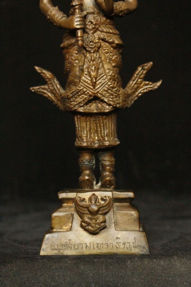 พระสยามเทวาธิราชองค์นี้สูงเก้านิ้วใกล้เคียงกับองค์จริงมากครับถ้าสูงรวมฐานเกือบ10.5นิ้ว ผิวพระเป็นเนื้อโลหะผสมผิวออกแดงแบบพระรัชกาลดูง่ายๆได้อายุ องค์พระปั้นแบบขึ้นหุ้นได้เหมือนองค์จริงมากดูได้จากพระหัตถ์ขวาถือพระขันธ์เอียงเล็กน้อย พระหัตถ์ซ้ายจีบพระองคุลีแนบพระอุระ ดั่งองค์จริง ที่ใต้ฐานหล่อมีปุ่ม จัดสร้างพิธียิ่งใหญ่มากเกจิอาจารย์มีชื่อเสียงในสมัยนั้นมาครบทุกองค์เพราะฉะนั้นเรื่องพุทธคุณบูชาได้อย่างหายห่วงครับ ยังไงลองดูครับกับพระสยามเทวาธิราชแท้ๆแบบต้นฉบับ ขอย้ำนะครับว่าแท้ๆ องค์นี้ไม่ใช้พระภูมิ หรือเจว็ด อย่างเด็จขาด สนใจสอบถามเพิ่มเติมได้ยินดีตอบทุกข้อสงสัย บ้านเรือนใดที่ยังไม่มีพระสยามเทวาธิราชไว้กราบไหว้บูชาควรมีไว้อย่างยิ่งครับเพื่อความเป็นมงคลแก่บ้านเรือน |