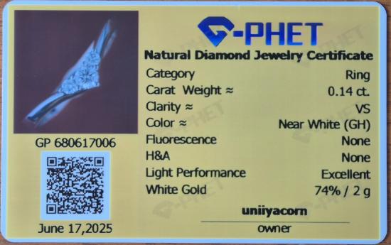 แหวนเพชร Grade GH/0.14 กะรัต น้ำหนัก 2 กรัม Gold 74% พร้อมบัตร G-phet